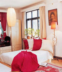 喜歡這個臥室的原因,是因為它既古典又現(xiàn)代。房頂掛著的紙燈籠,墻上30年代的上海女子,這些細(xì)節(jié)仿佛都讓人感覺回到了那個年代。但是請注意哦,臥室中最重要的家具——床,是沒有床腳的哦。是不是有點榻榻米的感覺?而白色和紅色的鮮明搭配又好像暗示著主人是個性情女子哦!海裝潢網(wǎng)
