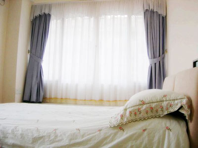 臥室的窗簾和床 藍(lán)色的窗簾與臥室搭配的非常好,看著很舒服