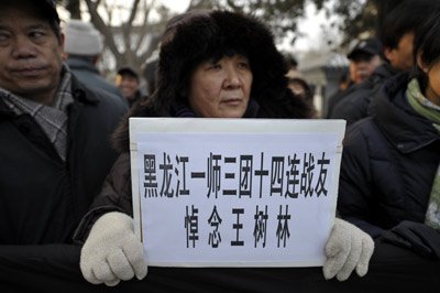 王樹林曾經(jīng)所在的黑龍江兵團的戰(zhàn)友今天也來到送別儀式現(xiàn)場,他們打著“黑龍江兵團戰(zhàn)友泣送王樹林”、“兄弟一路走好”的橫幅,高喊著“王樹林一路走好”,幾位女士流下了熱淚。