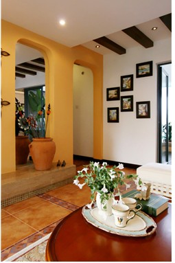 用白色椅面的沙發(fā)坐椅給客廳鋪展一片白沙般的夏日效果,沙發(fā)布藝應(yīng)該以棉織物為主,圖案選擇格子、條紋或花朵圖案都很恰當(dāng),簡單卻豐富的藍(lán)白組合圖案最易傳達(dá)出普羅旺斯鄉(xiāng)村的獨有神韻。沙發(fā)區(qū)可以鋪一塊圖案繁復(fù)的歐式地毯,來表現(xiàn)鮮明的異域感。墻面使用淡黃色,可以讓圓拱穹頂更加明朗、柔和。地中海風(fēng)格的住宅少有浮華的裝飾,生活空間的休憩區(qū)力求柔軟舒適,最后,在藍(lán)白主色調(diào)中加入一點紅,營造純樸輕松的環(huán)境。