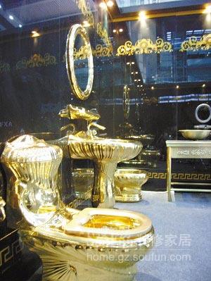 記者發(fā)現(xiàn),這套包括一只馬桶、一個洗手臺和一面鏡子的金光閃閃的廁具,看不出有什么特別之處。但細細一看,你會發(fā)現(xiàn)它的表面均是以18K金燒制而成的馬桶確實讓人驚異。據(jù)介紹,加上化妝鏡和盥洗設備這套金光閃閃的廁具總共需要180萬元。