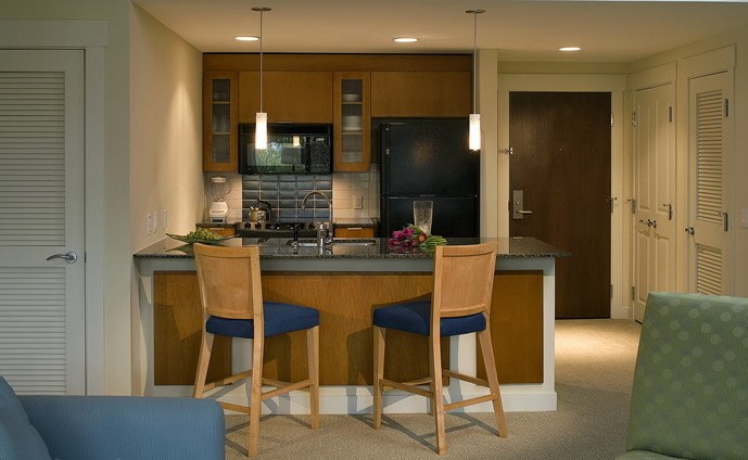 空間較小的情況下,廚房不適合單獨(dú)隔起。這樣的島臺(tái)的設(shè)計(jì)既將廚房與其他空間相隔離,又營造了時(shí)尚的居家氣氛。