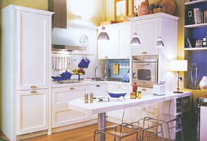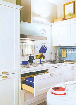 白漆櫥柜令小廚房充滿了明亮印象,人造石臺(tái)面與櫥柜渾然一體,品質(zhì)感絲毫不減。在與壁柜相接的空白墻面上,天藍(lán)色玻璃馬賽克令流動(dòng)的視覺產(chǎn)生出美妙的變化。所有的餐廚用具都以藍(lán)色、白色和金屬色為主,統(tǒng)一的色彩使小廚房里沒有任何的雜亂。