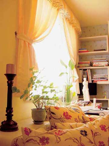 窗臺的綠植與沙發(fā)的花朵圖案,籠罩在鵝黃色紗簾下的柔和陽光里,綻放一室的溫馨芬芳。