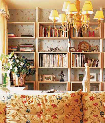 最值得玩味的是,各種花朵元素被精心安排在各處,巧妙地呼應(yīng)著居室的主題。同樣的藍(lán)色壁紙上對比運(yùn)用了田園風(fēng)格的枝葉繁茂的大團(tuán)花與清新簡潔的小碎花;白色的書柜特意選擇了無背板的設(shè)計,可以透露出壁紙的花色,在細(xì)節(jié)的微小之處更體現(xiàn)了空間延伸的概念;鵝黃紗幔上的淡雅提花和白底沙發(fā)上的紅、藍(lán)花朵又與房間主色和諧一致;甚至在浴室的墻面和門上都不忘裝飾上花朵元素;更有花瓶中絢爛的藍(lán)、白花卉點(diǎn)綴其中,營造出猶如夢幻般的私家花園的居室,一切都令人感覺那么愜意、愉悅。