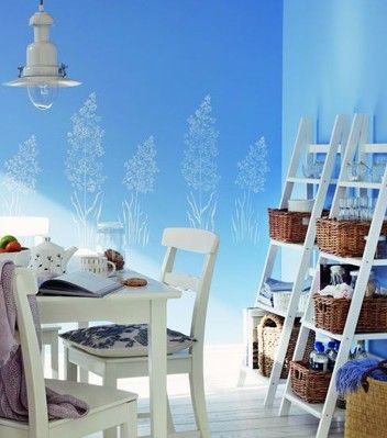 餐廳的墻面背景墻,手繪白色的植物做為裝飾,陽光從窗戶里泄進來,這個采光非常好的餐廳。稱以柔和藍色的墻面漆,雖然裝飾品沒有,但是陽光、植物就是最好的裝飾品了