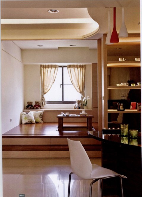 這個(gè)空間仿和室的做法,拉門使用棉質(zhì)玻璃搭配淺白橡木框,讓從窗臺(tái)進(jìn)來的陽光可通過玻璃照射到吧臺(tái)區(qū)。地板、階梯,甚至客廳的窗邊柜,都提供充足的收納空間。