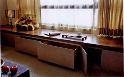 以深色的柚木集成材作框,搭配染白橡木門片,讓空間更具休閑感,而客廳觀景沙發(fā)座同時(shí)也是客廳重要收納柜??臻g的質(zhì)量感,在家具選材上有著重大關(guān)系,簡(jiǎn)單的裝飾,上等的材料更容易讓空間有質(zhì)感。