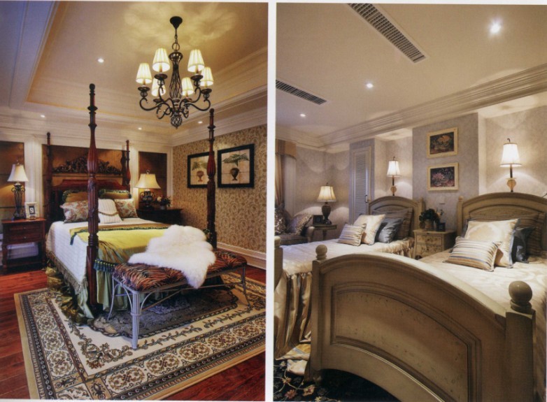 主臥的古典四柱大床成為了此空間的主角。床背三面圍合的英式花布裁制的床幔,搭配形式多樣、色彩和諧的床品以及重彩手工塊毯,使得臥室空間的氛圍溫馨而怡人。梳妝臺的古樸,床前凳的優(yōu)雅,休閑沙發(fā)的美艷,器皿擺件的多樣及壁畫的豐富,無不表達(dá)著男女主人愛家、愛生活的**和浪漫情趣……