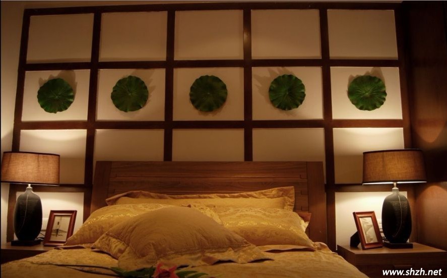 以五片荷葉為背景的背景墻嵌入周圍的實(shí)木格,再搭配床頭柜和臺(tái)燈,別有一番韻味。邊桌、臺(tái)燈,壁掛,都有著傳統(tǒng)的亞洲風(fēng)格特色。南亞風(fēng)情標(biāo)志性
