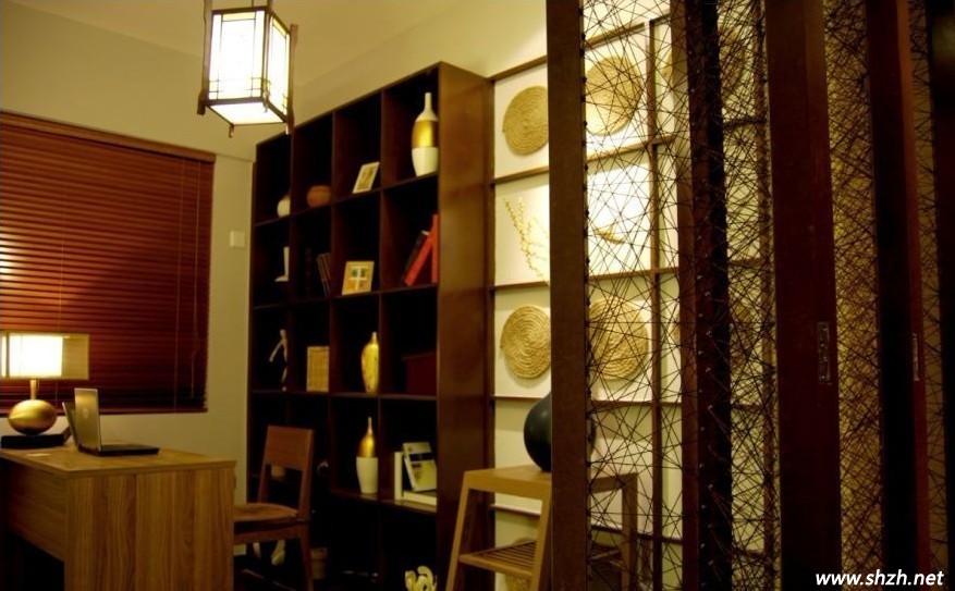 略有些復(fù)古風(fēng)格的書房,家具也有東南亞風(fēng)格的特點(diǎn)。