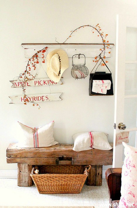 實(shí)木的板凳帶來一種質(zhì)樸的美感,編制的小筐子可以放置常用的小物件,十分精美且又實(shí)用。使用舊的木板做成的掛鉤更具有歷史的滄桑感。
