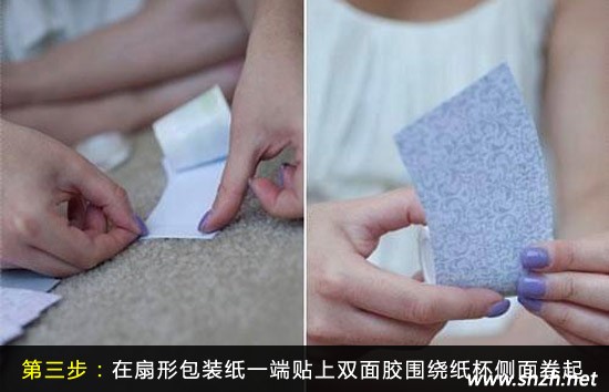 第三步,扇形的包裝紙剪下來之后,在每張包裝紙的寬度一側(cè)黏上雙面膠。然后一個(gè)個(gè)圍繞著杯子的側(cè)面輕輕地卷起來。