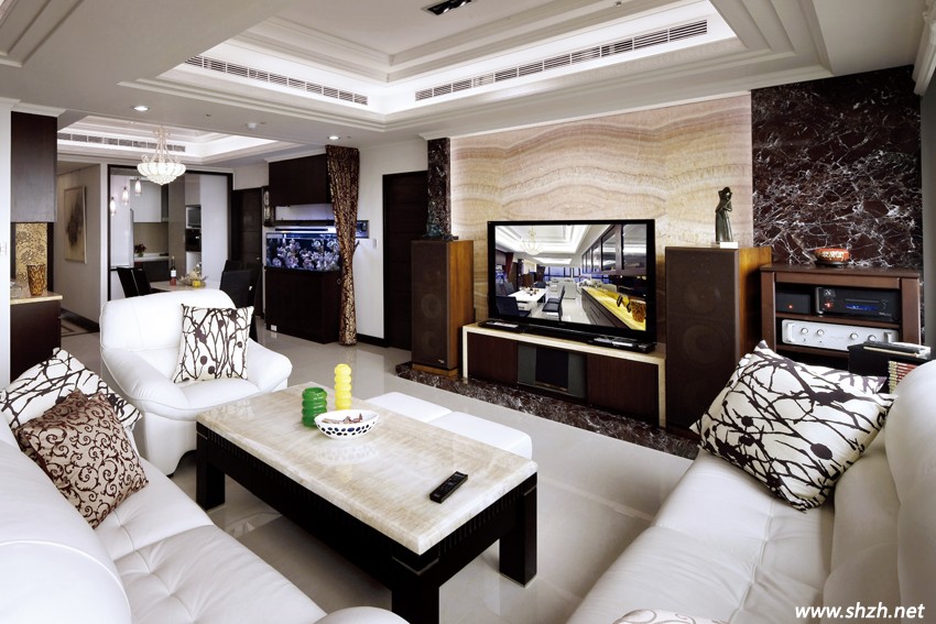氣勢十足的公共空間為開放式規(guī)劃,客廳擺設(shè)著比例和諧、質(zhì)型俱佳的白色皮革訂制家具,視覺上不以制式的裝置元素切割平面,反而以更圓融純熟的手法營造連續(xù)面的整體美。氣勢恢弘的電視主墻中央同樣精選稀有的天然玉石精工打造,華麗而細(xì)膩的對花紋理,本身就是令人嘆為觀止的裝置藝術(shù),兩側(cè)搭配氣質(zhì)沉穩(wěn)的深金峰石材,運用色彩的深淺對比加強大面積量體的變化。避免繁復(fù)的裝飾線條喧賓奪主,僅在連續(xù)的落地大窗前方點綴局部藝術(shù)線板,帶出新古典特有的優(yōu)雅因子。