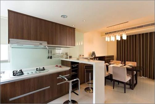 開放式廚房就是要求廚房不封閉,與其他空間,主要是餐廳能夠合二為一。這樣做不僅能夠起到很好的裝飾效果,整體的生活品位也會相應(yīng)提高。這么做最大的弊病就是無法控制油煙??墒侵灰銚Q個(gè)思路,將廚房墻壁做成透明的,就可以既控制了油煙,又保證了視覺上的通透。