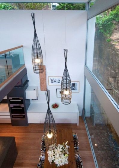 從樓上看這個(gè)餐廳燈具,燈具的造型都非常別致,使用黑色金屬作為燈罩,卻突出了天然的感覺又不失時(shí)尚元素。