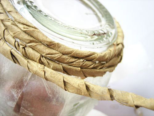 在瓶子表面貼上雙面膠。把紙繩從底部開始一圈一圈繞著瓶子纏,纏的過程中,用手按壓,使其粘得牢固。