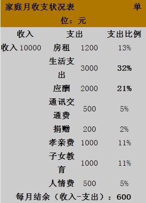 房租:1200元/月。吃飯:家用,3000元/月。應酬:1500--2000元/月。手機交通費用:500元/月。支助貧困山區(qū)小朋友,200/月。每月固定給父母親生活費:1000元/月。小侄兒的學習基金:因為哥哥條件一般,所以我現在開始存錢,負擔我小侄兒成人后的學習基金。1000元/月。偶爾特殊費用,如朋友結婚,生日等,500--1000元/月。