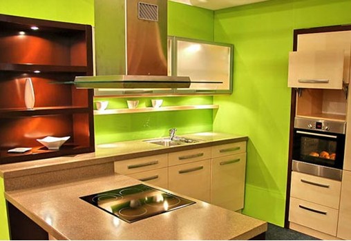 廚房色彩:廚房是烹飪的場所,顏色表現(xiàn)應(yīng)以清潔、衛(wèi)生為主??紤]到廚房在使用中易發(fā)生污染,需要經(jīng)常清洗,因此,應(yīng)選用白色或灰色為主。地面不宜過淺,可采用深灰色、棕色等耐污性強(qiáng)的色彩。灶具周邊墻面宜選用白色的墻面磚,便于清潔整理。