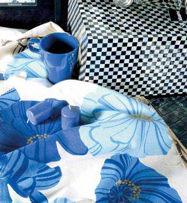 景泰藍(lán)工藝版畫效果的插畫圖案棉布,線條流暢,畫面色彩立體感強(qiáng)、現(xiàn)代與古典氣息濃厚,同時(shí)其質(zhì)地細(xì)密綿厚,可以在空間做大面積鋪陳,營(yíng)造出一種充滿個(gè)性的藍(lán)調(diào)空間,搭配深色高光感家具,有時(shí)尚藝術(shù)風(fēng)情。
