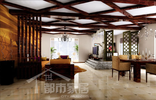 走進(jìn)客廳,一幅綺麗壯觀的異域畫卷展開(kāi)在我們眼前。天花板上縱橫交錯(cuò)的梁像把我們帶進(jìn)了原始叢林一般。橫梁是老榆木的,客廳餐廳的吊頂全是這樣,這部分一共花了八千左右。
