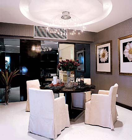 客廳、臥室和書房到處陳列著年輕新貴所喜愛的藝術擺設,洗手間也以紫啡色調的玻璃馬賽克為鋪地和墻身貼面,并配以茶色鏡面,加上石臺的折射,讓里外的空間都統(tǒng)一在另類、浪漫的格調之中。淡淡的悠然從客廳流淌到飯廳,匯入純潔的白,激蕩起一輪輕快的圓舞曲,一路高調,意欲歇而情不止……
