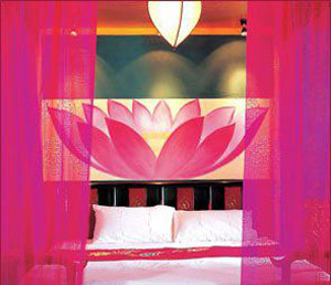 餐桌背后一幅壁畫,暗綠的底色上開了粉盈盈的桃花,娜姆解說:“當初想讓它帶來桃花運。”沒有理睬我們一臉的錯愕,接著說,“浴室的墻上是牡丹,那表示想追求榮華富貴?!薄艾F(xiàn)在床頭的蓮花,”她的聲音明顯柔和下來,“那是佛祖蓮臺的象征,也是人心靈的最后皈依?!?