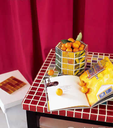 透明的馬賽克可以用來做燭臺,因為燭光能夠透過馬賽克朦朦朧朧灑出來,又不似透過普通玻璃那樣直白。還有實用的紙巾盒、花瓶都可以用馬賽克來制做,一樣的餐桌不一樣的風(fēng)情。
