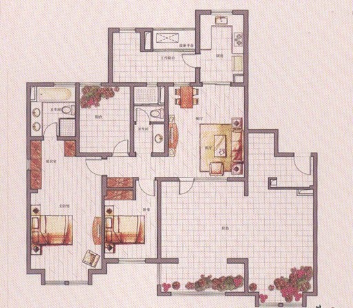 3、餐廳位于各功能區(qū)的入口,不便于餐廳家具擺放,并且破壞餐廳的完整性。