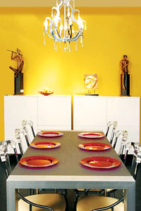 在這個(gè)春天,造型別致的新懷舊吊燈將是扮靚餐桌的不錯(cuò)選擇。黃色的燈光從四周傾瀉而下,讓冰冷明亮的金屬餐具似乎都能迸發(fā)出強(qiáng)烈節(jié)奏。散布于柜體后的小射燈將光線聚焦于主人從各地淘來(lái)的擺件。明黃色、玫瑰色、金色在暖調(diào)燈光中躍動(dòng)著,亞克力、金屬、黑橡三種元素構(gòu)建的餐桌椅與暖色的燈光形成了一種材質(zhì)與光線的游戲。