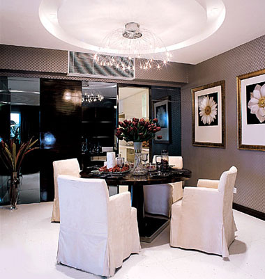客廳、臥室和書房到處陳列著年輕新貴所喜愛的藝術(shù)擺設(shè),洗手間也以紫啡色調(diào)的玻璃馬賽克為鋪地和墻身貼面,并配以茶色鏡面,加上石臺(tái)的折射,讓里外的空間都統(tǒng)一在另類、浪漫的格調(diào)之中。淡淡的悠然從客廳流淌到飯廳,匯入純潔的白,激蕩起一輪輕快的圓舞曲,一路高調(diào),意欲歇而情不止。