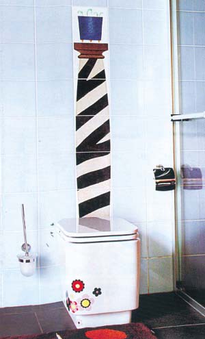 馬桶上方的墻面沒(méi)有很多空間可以自由有發(fā)揮,而且還要和馬桶搭配和諧。六片花磚組成的一組圖案,在設(shè)計(jì)中加入一些卡通的概念在里面,是使空間變得活潑的一種方法,而且在運(yùn)用時(shí)宜精不宜多。
