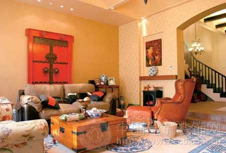誰都躲不過這迎門第一眼的門中門——仿古朱門 裝飾安排在正廳正墻的正座沙發(fā)上方,主人彰顯的個(gè)性呼之欲出。在暖黃色系的溫柔中,典型的西式沙發(fā)圍繞著中式箱臺(tái),美式壁紙上的小花映襯出地毯上的景泰藍(lán);唐人畫下鐵皮壁爐的火正旺,燃燒著一派英倫風(fēng)采。陶瓷碗錯(cuò)落著歐典盤,雕花櫥柜旁停著手工編織籃——從家具到軟裝,從材質(zhì)到家紡,僅是客廳一處便盡覽中式、新古典、美式鄉(xiāng)村、歐式等諸多風(fēng)情。這似乎漫不經(jīng)心的隨意設(shè)計(jì),卻自然地和諧在一派輕快溫馨的調(diào)子中,給人第一眼的驚鴻一瞥后,又情不自禁地去尋味每一件家居品位,似乎件件都有一段故事,這就是混搭家裝的魅力。