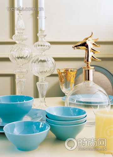 餐桌的線條帶著鮮明的復古風潮,在背景墻的襯托下有種歲月沉淀的優(yōu)雅韻味?;野椎闹魃{(diào)也給餐桌布置上留下更多揮霍色彩的空間。天空一般純凈的藍色餐具,嬌嫩的花朵搭配細頸寬口花瓶,華貴的金色酒杯以及晶瑩剔透的燭臺,讓古典餐桌霎時渲染上現(xiàn)代式的優(yōu)雅。顏色純美干凈的餐具會讓人有種想品嘗美食的沖動,為了營造更加純凈的氛圍,燭臺、酒杯與酒瓶都選擇無色透明的玻璃材質(zhì),而一點金色的點綴更增添了一份高貴氣質(zhì)。