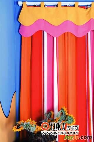 5.設(shè)計窗簾時要注意因勢利導、因人而異,根據(jù)窗戶的特點和使用者的性格特征來設(shè)計。此間兒童房的窗簾采用分體式設(shè)計。上半部圓弧形部分是用棉布做出自然褶度的異型窗簾,以魔術(shù)貼固定在窗框上,拆卸清洗均十分方便;下半部則是用彩色條紋棉布制成的卷簾,在卷簾下部開了個高叉,兩邊則配以紐扣和紐孔。這樣,即使卷簾放下的時候,也能很方便地把卷簾一角掀開,以紐扣在相應部分固定好,以獲取光線,符合兒童的需要。