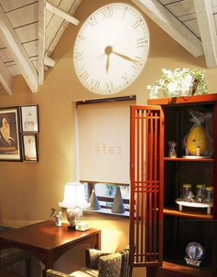 刷白的尖形木屋頂下,粉紅粉綠調(diào)的掛畫、彩繪的花瓶、咖啡杯、還有一眼便難忘的那用英式復(fù)古瓷磚貼成的壁爐式墻面,臨近傍晚的時候,對著街道的窗戶上,投影著一個圓形鐘,用影子在行走時間的鐘,下面的窗簾上印著褐色的café字母。時光和咖啡香一樣,此刻感覺因太過悠閑而變得縹緲