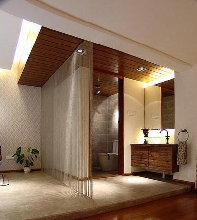這款衛(wèi)生間設(shè)計(jì)非常大膽,本來是想做半敞開式,后來經(jīng)過修改,將馬桶單獨(dú)隔了一起來,將洗手臺(tái)放在外面,類似公共場(chǎng)合。由于相連的空間是游戲室,還擺放了一張麻將臺(tái)子、為了整理美觀考慮,在這間加了一道從頂而下的簾子,絲毫沒有突兀的感覺。