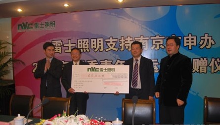 11月7日,國(guó)內(nèi)照明行業(yè)領(lǐng)軍企業(yè)雷士照明向南京2014年第二屆夏季青年奧運(yùn)會(huì)申辦委員會(huì)捐贈(zèng)200萬(wàn)元,支持南京的申辦行動(dòng)。這是自2007年8月南京代表中國(guó)申辦青年奧運(yùn)會(huì)夏季運(yùn)動(dòng)會(huì)以來(lái)接收的第一筆社會(huì)捐贈(zèng),同時(shí)也意味著南京申辦青奧會(huì)進(jìn)入沖刺階段。