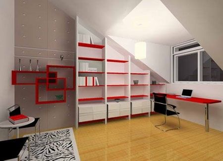 一間簡單的書房一般陳設(shè)有寫字臺(tái)、電腦操作臺(tái)、書柜、坐椅等。書房的家具除了要有書櫥、書桌、椅子外,兼會(huì)客用的書房還可配備沙發(fā)茶幾等。書櫥應(yīng)靠近書桌以便存取方便,書櫥中可留出一些空格來放置一些工藝品以活躍書房的氣氛,書桌應(yīng)置于窗前或窗戶右側(cè),以保證看書、工作時(shí)有足夠的光線,并可避免在桌面上留下陰影。書桌上的臺(tái)燈應(yīng)靈活、可調(diào),以確保光線的角度、亮度,還可適當(dāng)布置一些盆景、字畫以體現(xiàn)書房的文化氛圍。