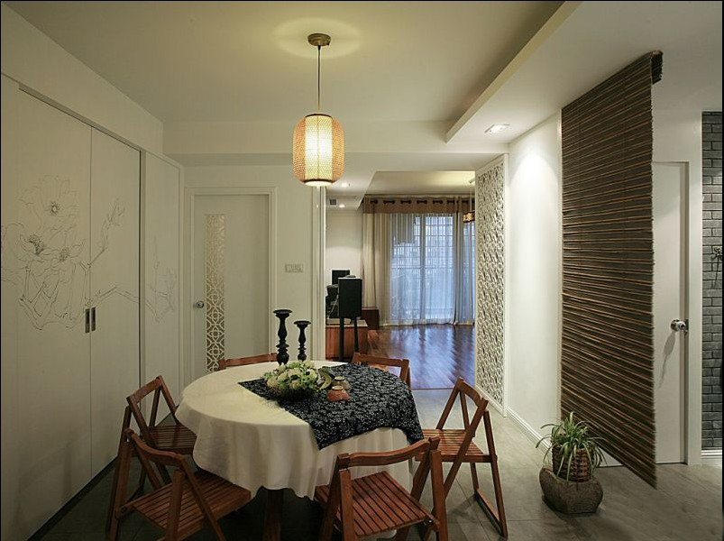 從餐廳里看不出這個家到底采用哪種風格?;蛟S餐桌上方的中國風十足的吊燈隱隱現出這是個中式風格。壁櫥上簡潔的圖案,雅致非常。